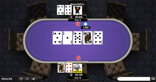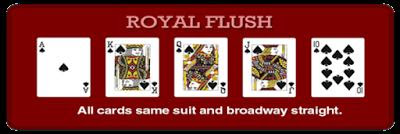 Bandar poker adalah permainan poker yang dimana setiap playernya berhak menjadi bandar dengan jumlah credit mencukupi, dalam meja 1000 anda harus memiliki minimal credit 35.000 anda sudah bisa dan berhak menjadi bandar. Cara bermain Bandar Poker yaitu sama seperti poker online pada umumnya hanya saja sebelum permainan di mulai, anda berhak menentukan taruhan yang akan anda pasang. Sebelum memulai permainan Bandar Poker, sebaiknya anda mengetahusi terlebih dahulu peraturan-peraturan cara bermain Bandar Poker online. Selanjutnya setiap player akan mencari kombinasi antara 2 kartu yang para player pegang dengan 5 kartu diatas meja untuk menghasilkan 5 kartu terbaik dan anda akan menang jika anda memiliki kombinasi kartu terbaik berikut urutan kartu yang di angap kartu tertinggi. Untuk mendapat jackpot anda hanya perlu menconteng kolom yang sudah di sediakan sebelum permaian dimulai conteng kolom Buy jackpot hanya dengan Rp.1000 jika anda beruntung maka anda akan mendapat jackpot besar. Jika Bandar dan pemain mendapatkan tingkat kartu yang sama misalnya 2 pair dengan pair yang sama, maka akan draw Member akan mendapatkan bayaran double jika mendapatkan kartu Royal Flush, contoh Royal Flush: |